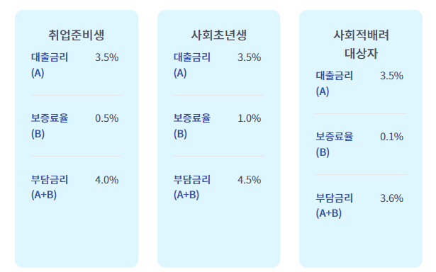 최업준비생의 경우는 대출금이와 보증료율을 합한 금리가 4.0%이며, 사회초년생은 4.5%, 사회적배려대상자는 3.6%로 가장 낮은 금리를 가지게 됩니다. 보증료는 햇살론유스의 보증금액 및 거치기간에 따라 달라질 수 있습니다.