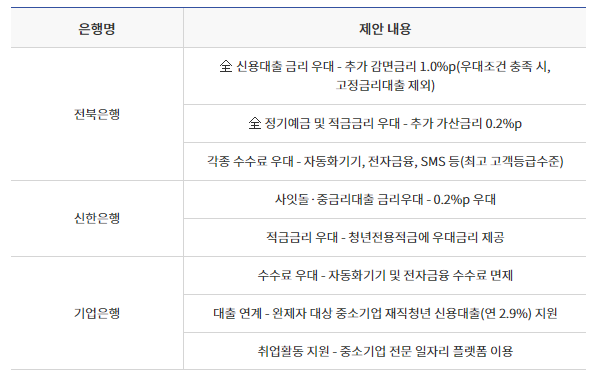 햇살론유스의 협약은행는 신한은행,기업은행,전북은행이 있는데요. 각 은행별로 우대하는 내용이 다른데요, 아래의 표에 정리해두었으니 확인부탁드립니다.