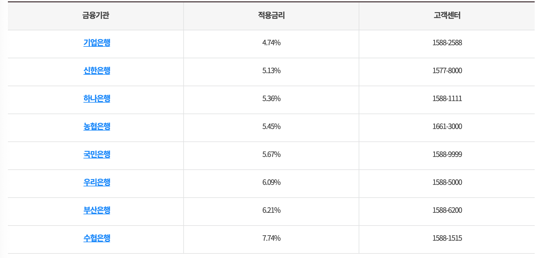 위의 금리는 HUG 보증으로 취급된 전세안심대출의 금리로, 실제 적용 금리는 대출희망 은행 페이지에서 확인해부시길 바랍니다.