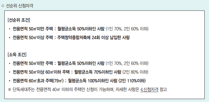 | 전용 50㎡ 이상 | 선순위 | 주택청약종합저축에 가입하여 24회 이상 납입한 사람 |