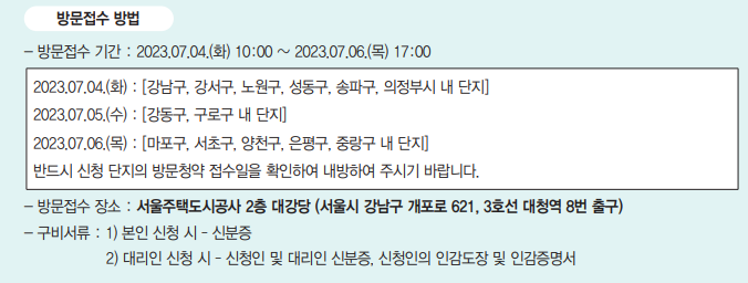 방문접수의 경우에는 중증장애인 및 만 65세 이상의 고령자 등 인터넷 청약에 어려우신 분들만 가능한데요. 서울주택도시공사 2층 대강당에서 신청이 가능하며, 신청단지별 접수일자가 다르니 꼭 확인하고 가시길 바랍니다.