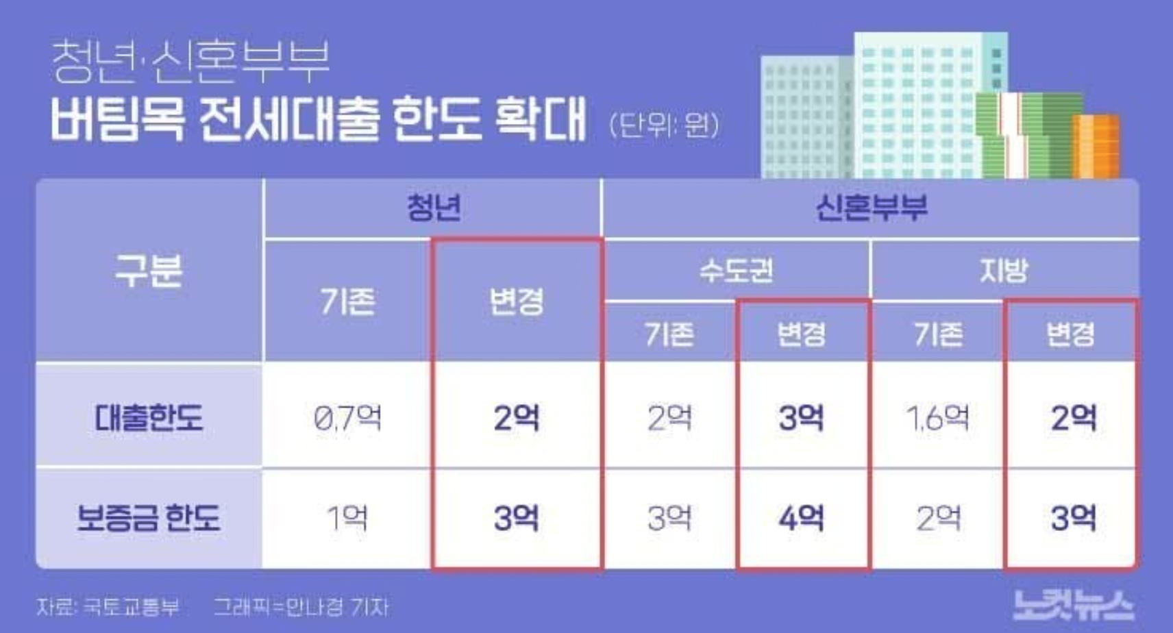 청년과 신혼부부 모두 주택도시기금의 버팀목전세대출 한도를 확대되었습니다. 기존에는 7천만원까지 가능했던 청년 버팀목전세자금대출 한도를 2억원까지 올렸으며, 신혼부부는 각각 2억, 3억원으로 상향했습니다.
