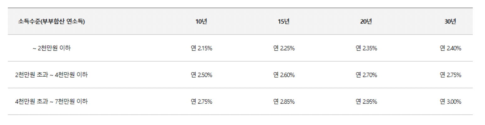 | 대출한도 | 2.5억원 이내 주택구입자는 3억원 이내 신혼가구는 4억원 이내 2자녀 이상 가구는 3.1억원까지 가능 |